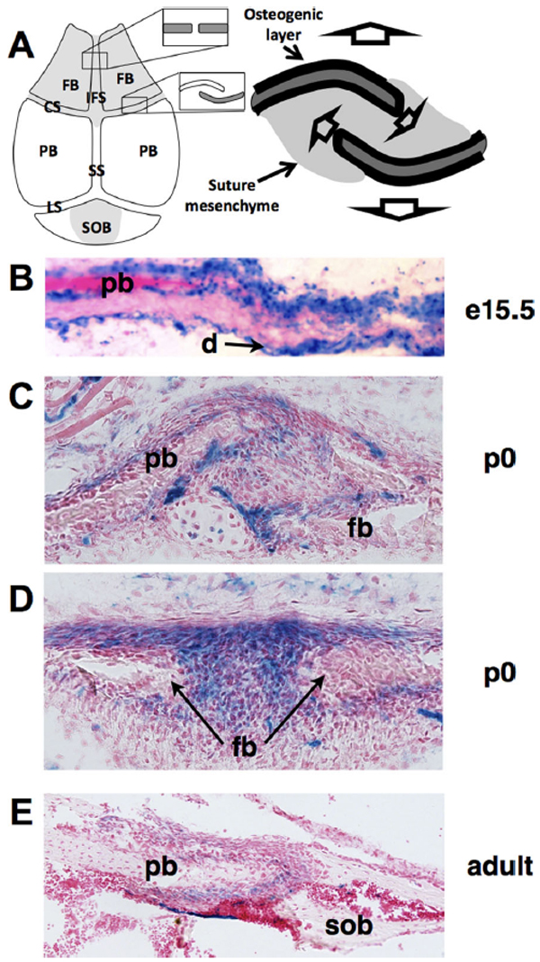 Expression was strongest in suture mesenchyme and adjacent bone fronts of both overlapping and abutting sutures.