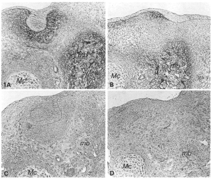 Expression was intense in the mesenchyme surrounding the epithelial cap, particularly in the region of the dental lamina connecting the dental to oral epithelium.