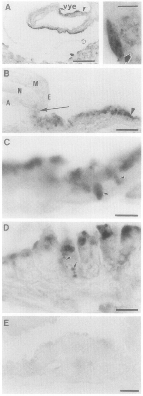 Expression on abembryonic side of endodermal cells of visceral yolk sac, appearing as small or round dots.