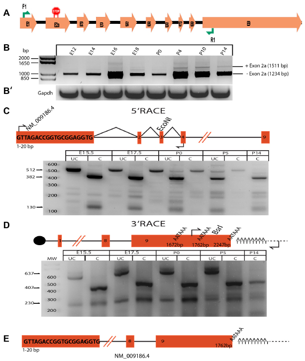 (a) Age of embryo at noon of plug day not specified in reference. (b) + Exon2a (c) - Exon 2a |