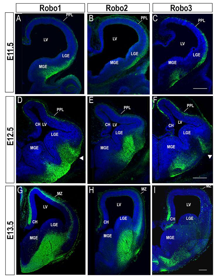 Expression appeared to be complementary to that of Robo3 within the subpallium, while overlapping with Robo1 in the lateral ganglionic eminence.