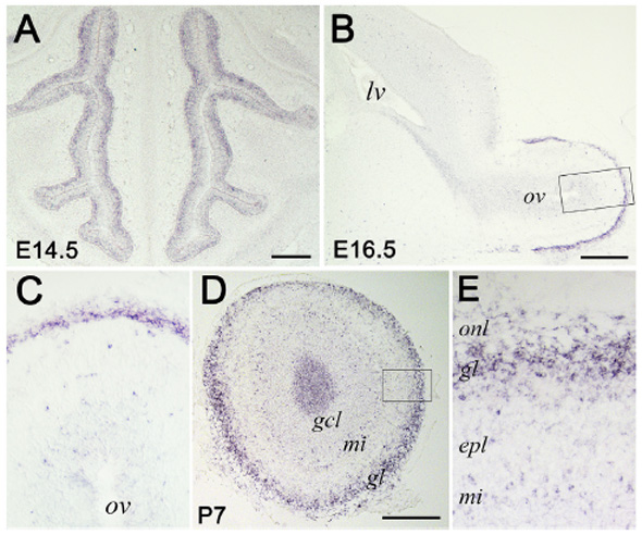 TS24: main olfactory bulb Present Regionally restricted 10C , 10B Expression is in the superficial layer of the olfactory bulb with little or no expression in the olfactory subventricular zone.