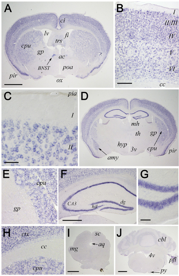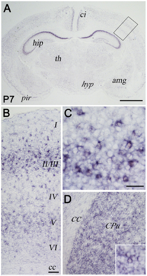 Note: (B) High power view of the rectangle in (A). (C) Higher magnification of the cortical layers II/III.