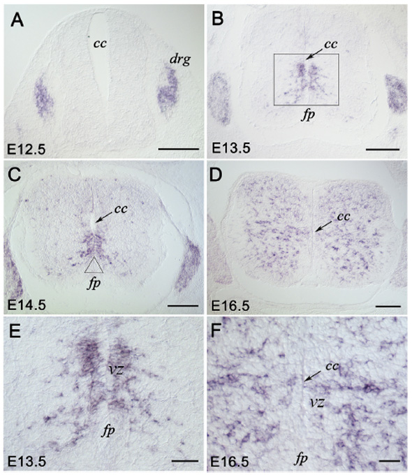 TS21: spinal cord Present Regionally restricted 8E , 8B Expression is in a subset of neuroepithelial cells in the ventral and caudal parts of the spinal cord adjacent to the floor plate.