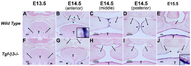 Reference: J:216310 Jin JZ, et al., Deciphering TGF-beta3 function in medial edge epithelium specification and fusion during mouse secondary palate development. Dev Dyn. 2014 Dec;243(12):1536-43