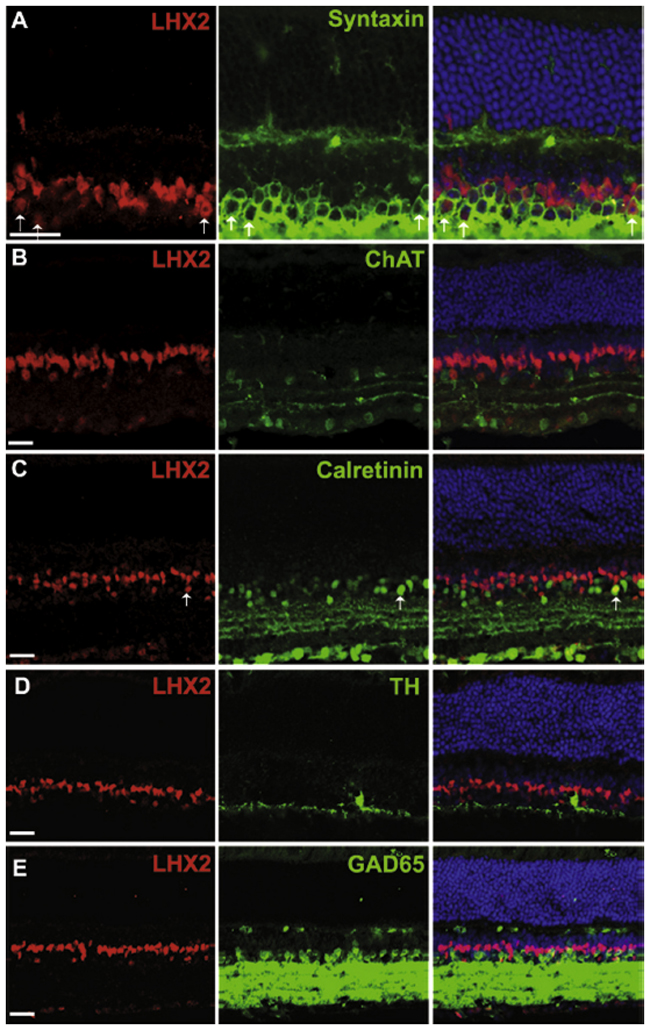 TS28: retina inner nuclear layer Present Regionally restricted 3E GAD65 , 3E merge Expression is in GABAergic amacrine cells.