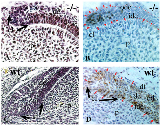 TS26: cervical loop Present 8B Expression in proliferating epithelial cells restricted in cervical loop area. Total number of proliferating cells in cervidal loop decreased by ~60%.
