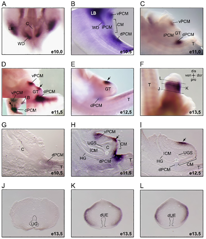TS19: cloaca associated mesenchyme Strong Regionally restricted 2D Highest expression at E11.5, when intracloacal mesenchyme (ICM), dorsal pericloacal mesenchyme (dPCM) and dorsal cloacal mesenchyme (CM) is observed.