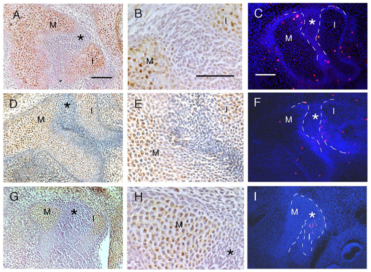 TS21: ossicle Present Single cells 1G Proliferating cells are seen in the malleus and incus.