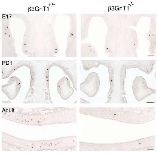 TS28: olfactory epithelium Present 4_ Adult beta-3GnT1-/- The immunopositive neurons were decreased in the mutant to <15% that of control littermates.