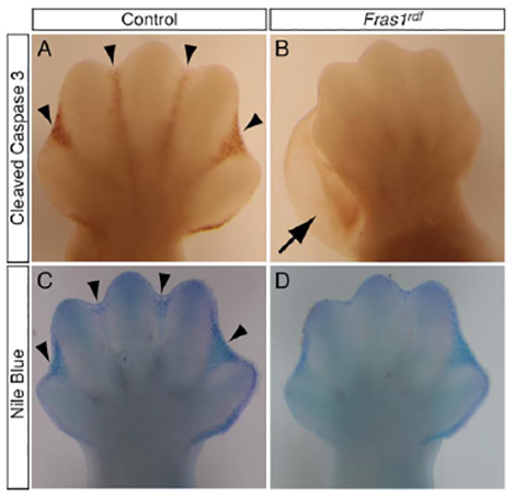 Reference: J:231083 Hines EA, et al., Syndactyly in a novel Fras1(rdf) mutant results from interruption of signals for interdigital apoptosis. Dev Dyn. 2016 Apr;245(4):497-507
