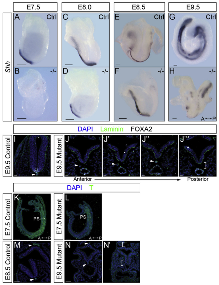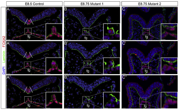 Note: Littermate control; this embryo might have been a heterozygote. Consecutive sections through embryo; also stained with anti-laminin (green) to outline the basement membrane.