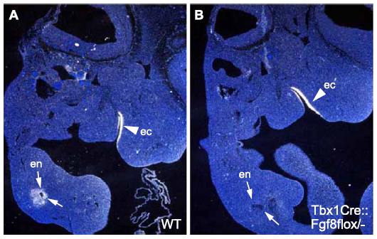 Reference: J:88814 Brown CB, et al., Cre-mediated excision of Fgf8 in the Tbx1 expression domain reveals a critical role for Fgf8 in cardiovascular development in the mouse. Dev Biol. 2004 Mar 1;267(1):190-202