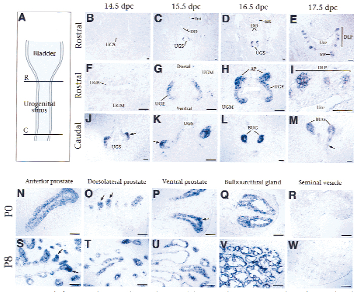 TS23: epithelium of pelvic urethra of male Present Regionally restricted 2C Expression is seen in the lateral urogenital sinus epithelium and is excluded from the dorsal and ventral sides; this is the region of the prospective prostate.