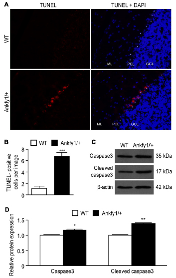 (a) Higher levels of Casp3 were detected in the cerebellum of Ankfy1/+ mice than in wild type. |