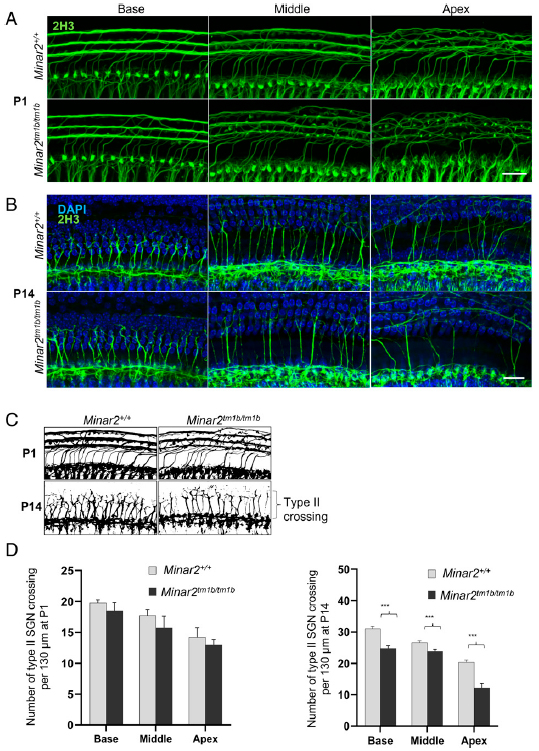 TS28: cochlea Present Regionally restricted 7B tm1b/tm1b Apex Reduction in number of crossings of type II nerves.