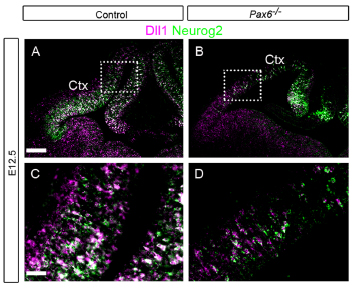 Note: The genetic background of the specimen was either wildtype or heterozygous. Double labeled: magenta - Dll1; green - Tbr2 (Eomes assay MGI:7335049).