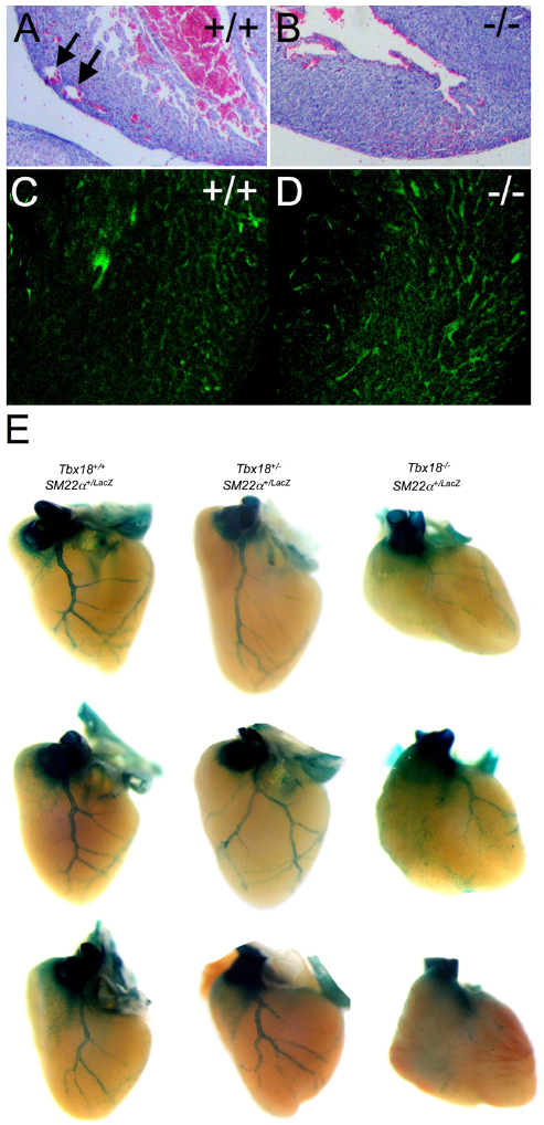 1E Tbx18+/-, SM22a+/LacZ lower: