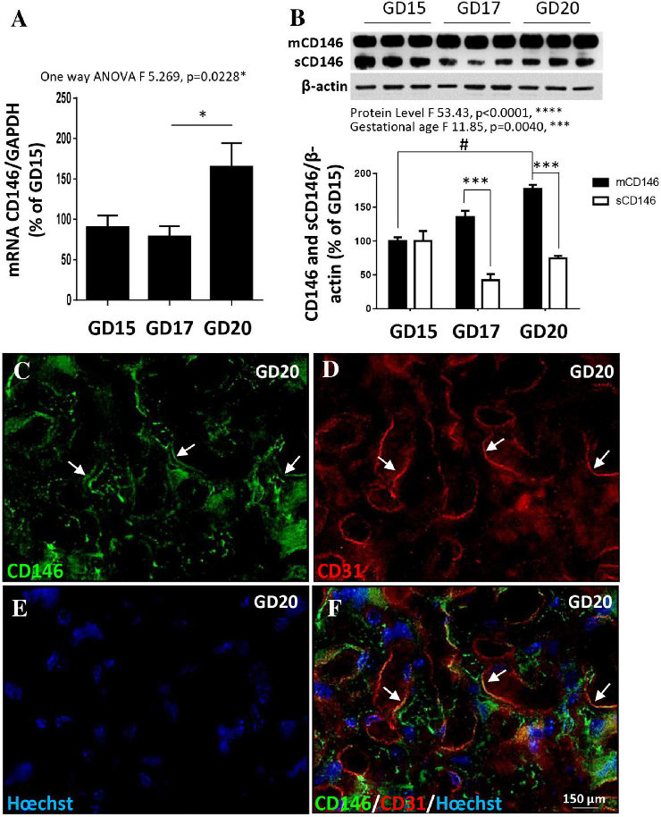 (a) Age of embryo at noon of plug day not specified in reference. (b) mCD146 (c) sCD146 (d) Soluble form detected after G1D15. No difference between membrane an soluble forms at this stage. (e) Membrane form progressively increased from GD15 to GD20. (f) Soluble form at significantly lower levels than membrane form at GD17. |