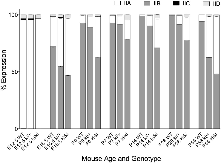 (a) Values are listed as levels of the Col2a1 IID isoform expressed as a percentage of the total copy number of IIA, IIB, IIC and IID in chondrocytes from wild type, ki/+ and ki/ki cartilage at each time point. Strength was assigned by curator as follows: >= 90% = strong; 10-89% = present; 1-9.9% = weak; 0.1-0.9% = trace; <0.09 = ambiguous; 0.00 = absent. (b) 3.34% (c) 3.43% (d) 3.42% (e) 1.23% (f) 2.29% (g) 2.81%. From E16.5 onwards, an increase in levels of the IID mRNA isoform was observed in ki/ki when compared to wild type cells. (h) 0.29%. Levels were barely detectable in the wild type. (i) 1.10% (j) 1.56%. An increase in levels of the IID mRNA isoform was observed in ki/ki when compared to wild type cells. (k) 0.80%. Levels were barely detectable in the wild type. (l) 1.04% (m) 4.43%. An increase in levels of the IID mRNA isoform was observed in ki/ki when compared to wild type cells. (n) 0.09%. Levels were barely detectable in the wild type. (o) 0.70% (p) 2.82%. An increase in levels of the IID mRNA isoform was observed in ki/ki when compared to wild type cells. (q) 0.04%. Levels were barely detectable in the wild type. (r) 0.47% (s) 2.11%. An increase in levels of the IID mRNA isoform was observed in ki/ki when compared to wild type cells. (t) 0.13%. Levels were barely detectable in the wild type. (u) 1.12% (v) 1.46%. An increase in levels of the IID mRNA isoform was observed in ki/ki when compared to wild type cells. |