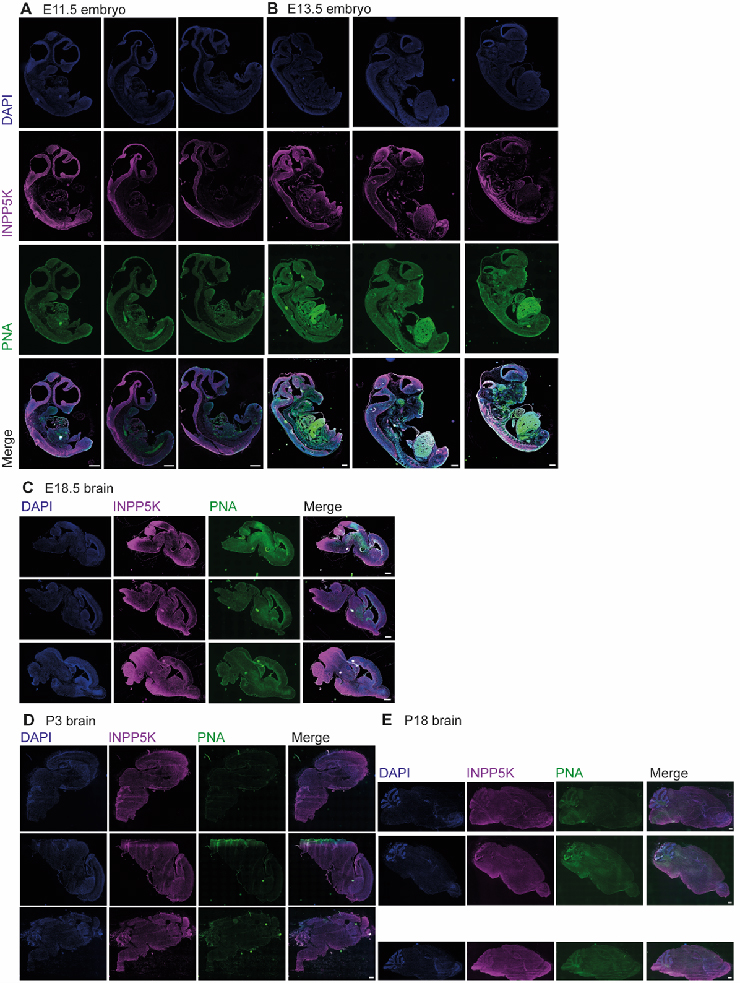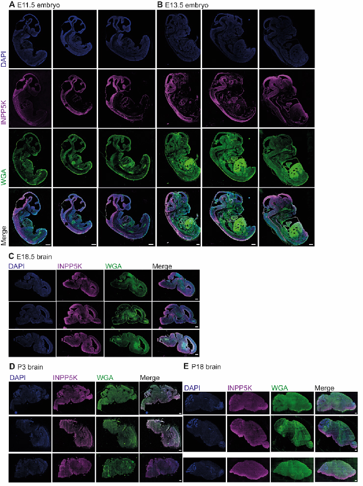 Note: Double labeled: magenta - Inpp5k; green - wheat germ agglutinin.