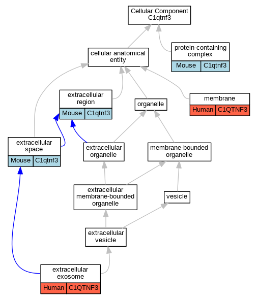| Cellular Component | GO:0005615 | extracellular space | C1qtnf3 | IDA | Mouse | PMID:20952387 | |