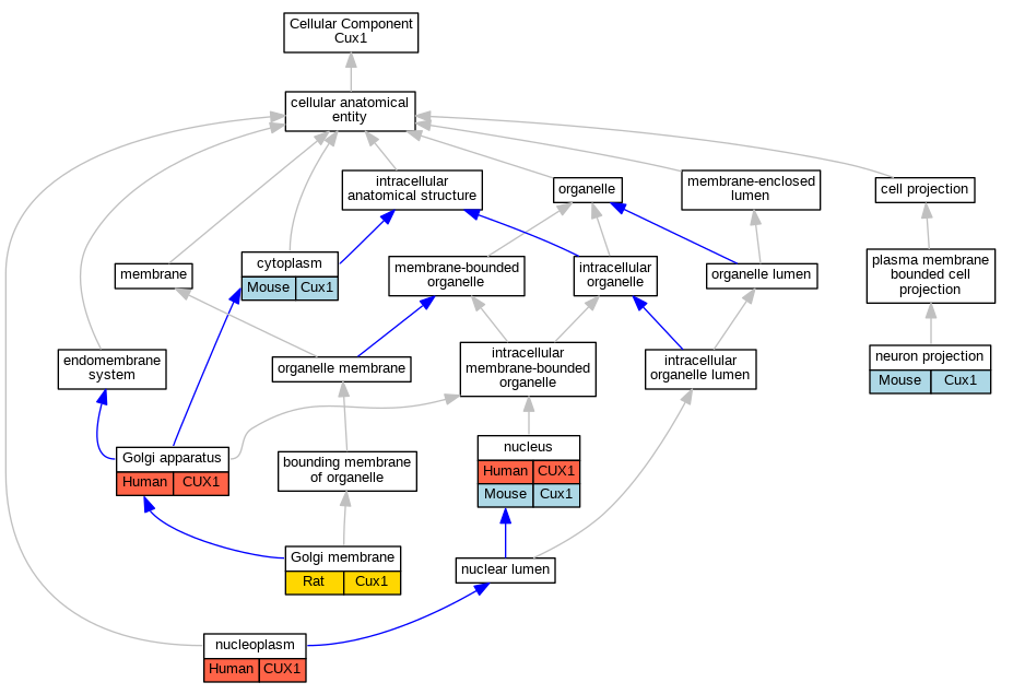 | Cellular Component | GO:0000139 | Golgi membrane | Cux1 | IDA | Rat | PMID:15718469|RGD:1599272 | |