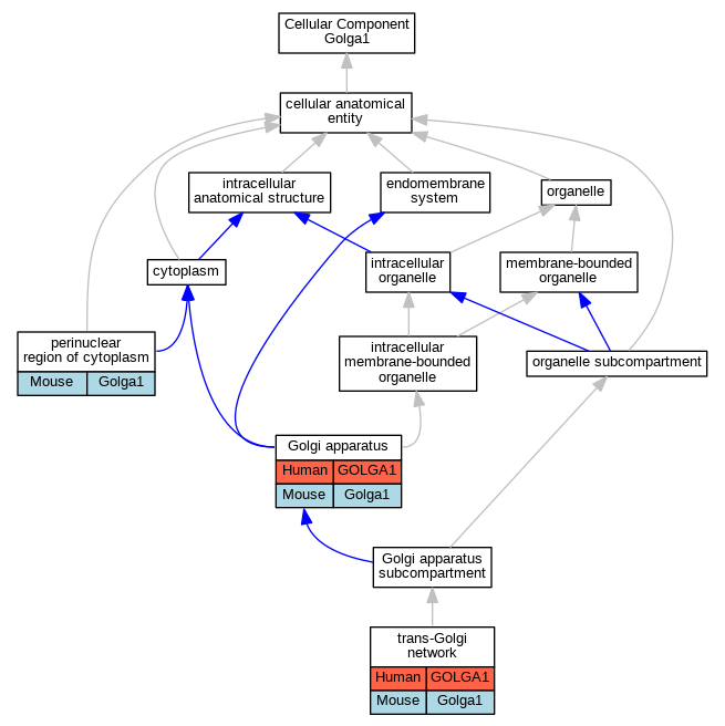 | Cellular Component | GO:0005802 | trans-Golgi network | Golga1 | IDA | Mouse | MGI:MGI:3814962|PMID:18827011 | |