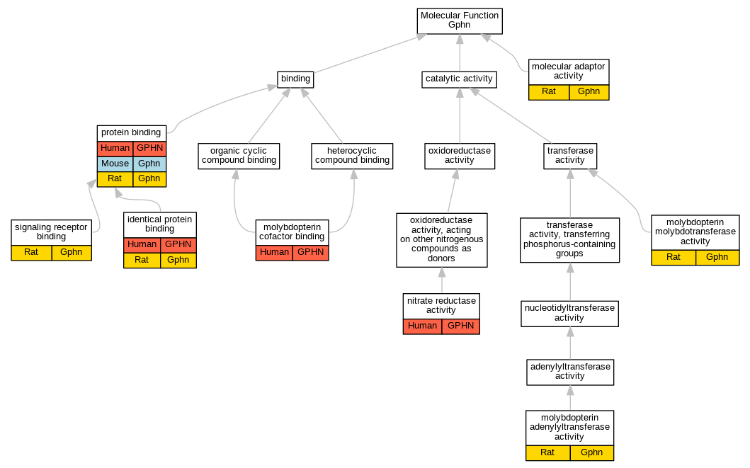 | Molecular Function | GO:0005515 | protein binding | Gphn | IPI | RGD:621118 | Rat | PMID:19755106|RGD:9831130 |