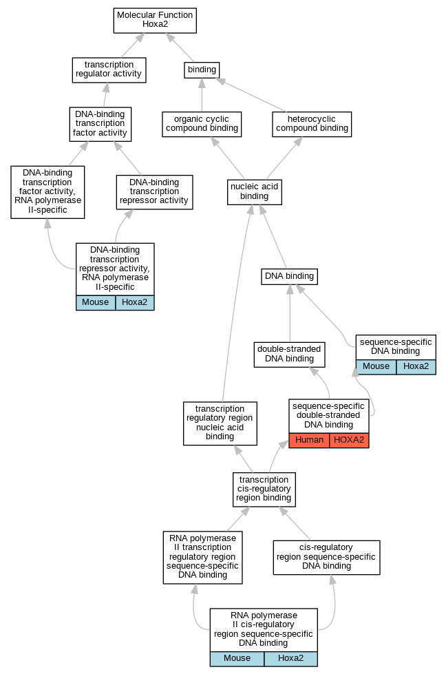 | Molecular Function | GO:0000978 | RNA polymerase II cis-regulatory region sequence-specific DNA binding | Hoxa2 | IDA | Mouse | MGI:MGI:3525808|PMID:15634706 | |