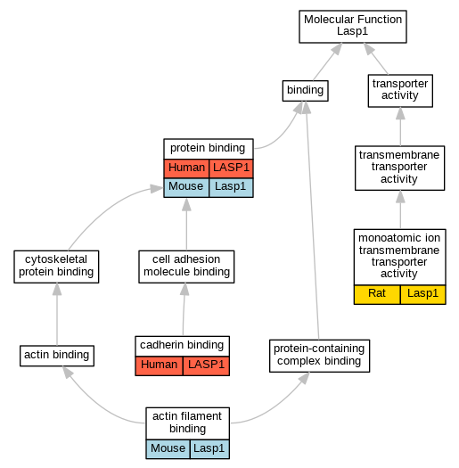 | Molecular Function | GO:0051015 | actin filament binding | Lasp1 | IDA | Mouse | PMID:15465019 | |