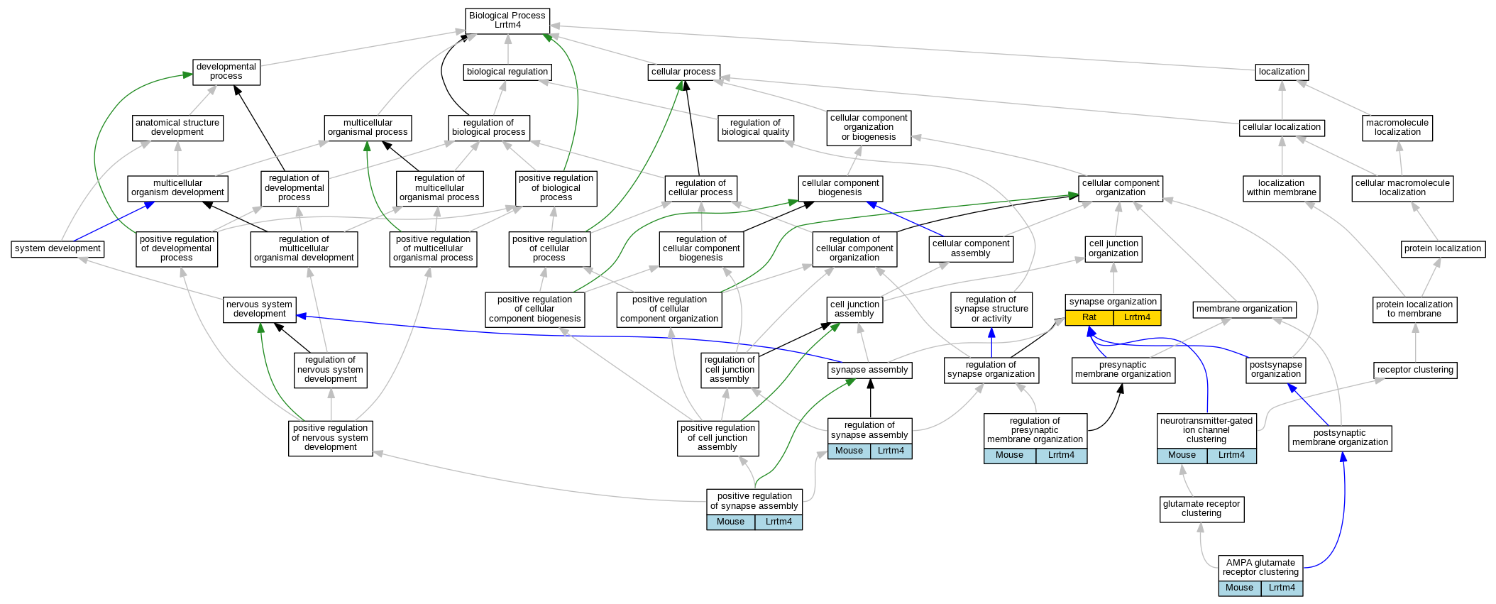 | Biological Process | GO:0097113 | AMPA glutamate receptor clustering | Lrrtm4 | IMP | MGI:MGI:5521326 | Mouse | PMID:23911104 |