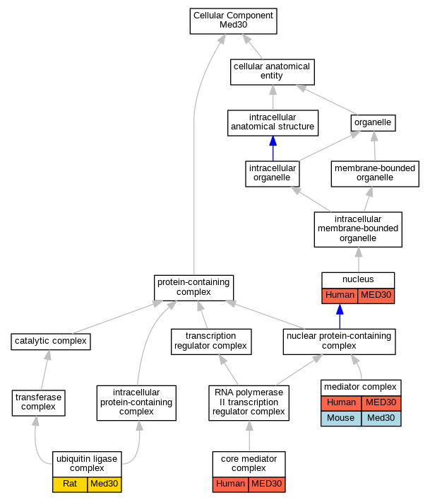 | Cellular Component | GO:0016592 | mediator complex | Med30 | IDA | Mouse | PMID:15340084 | |
