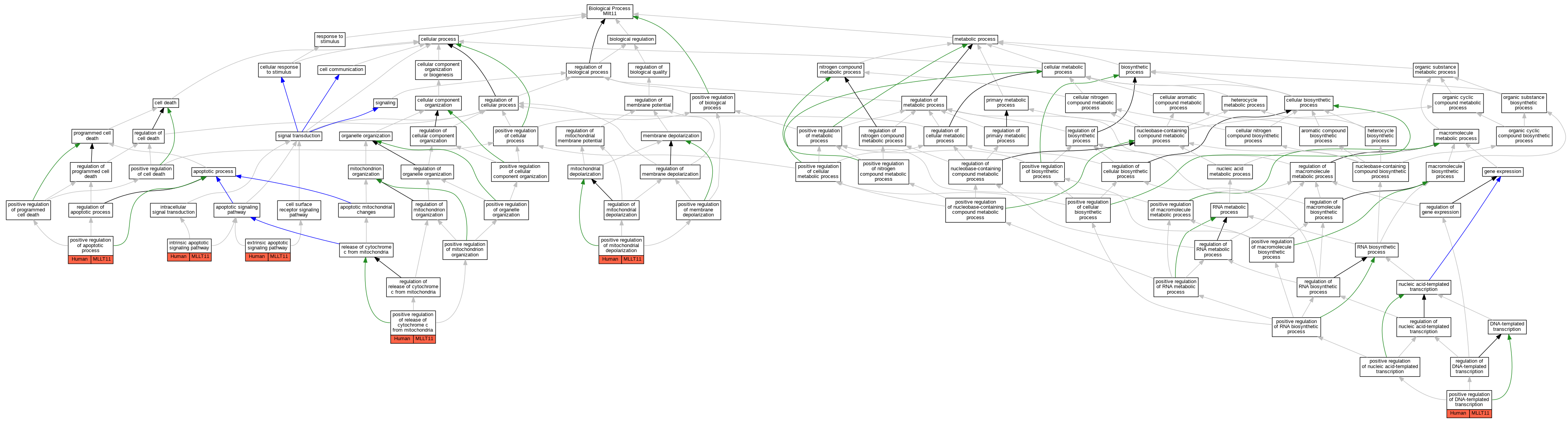 | Biological Process | GO:0097193 | intrinsic apoptotic signaling pathway | MLLT11 | IDA | Human | PMID:18852119 | |