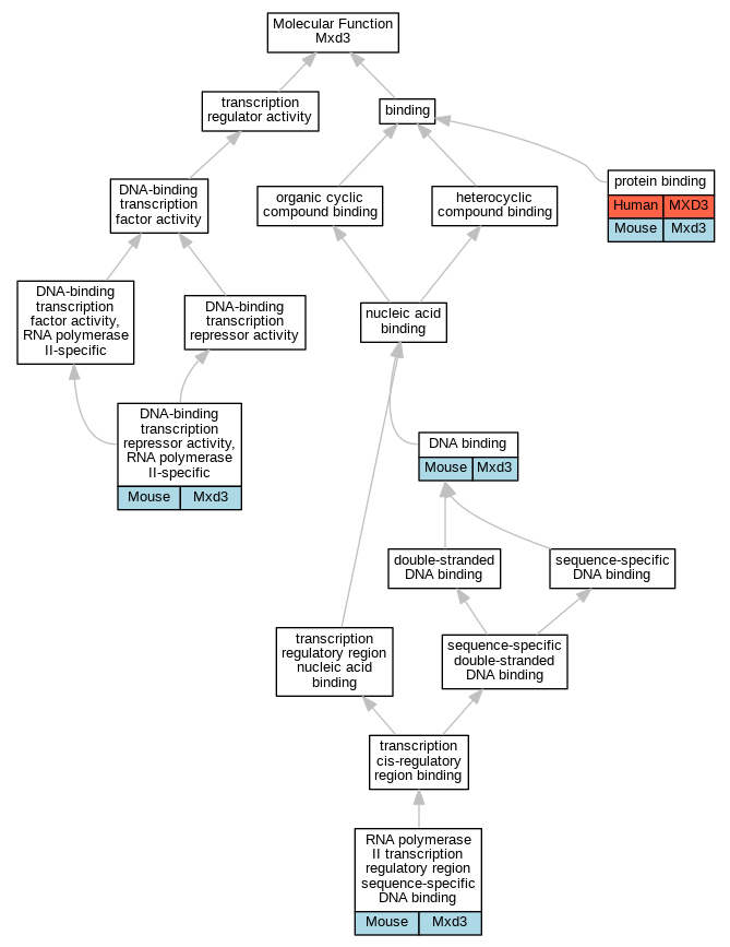 | Molecular Function | GO:0003677 | DNA binding | Mxd3 | IDA | Mouse | PMID:8521822 | |