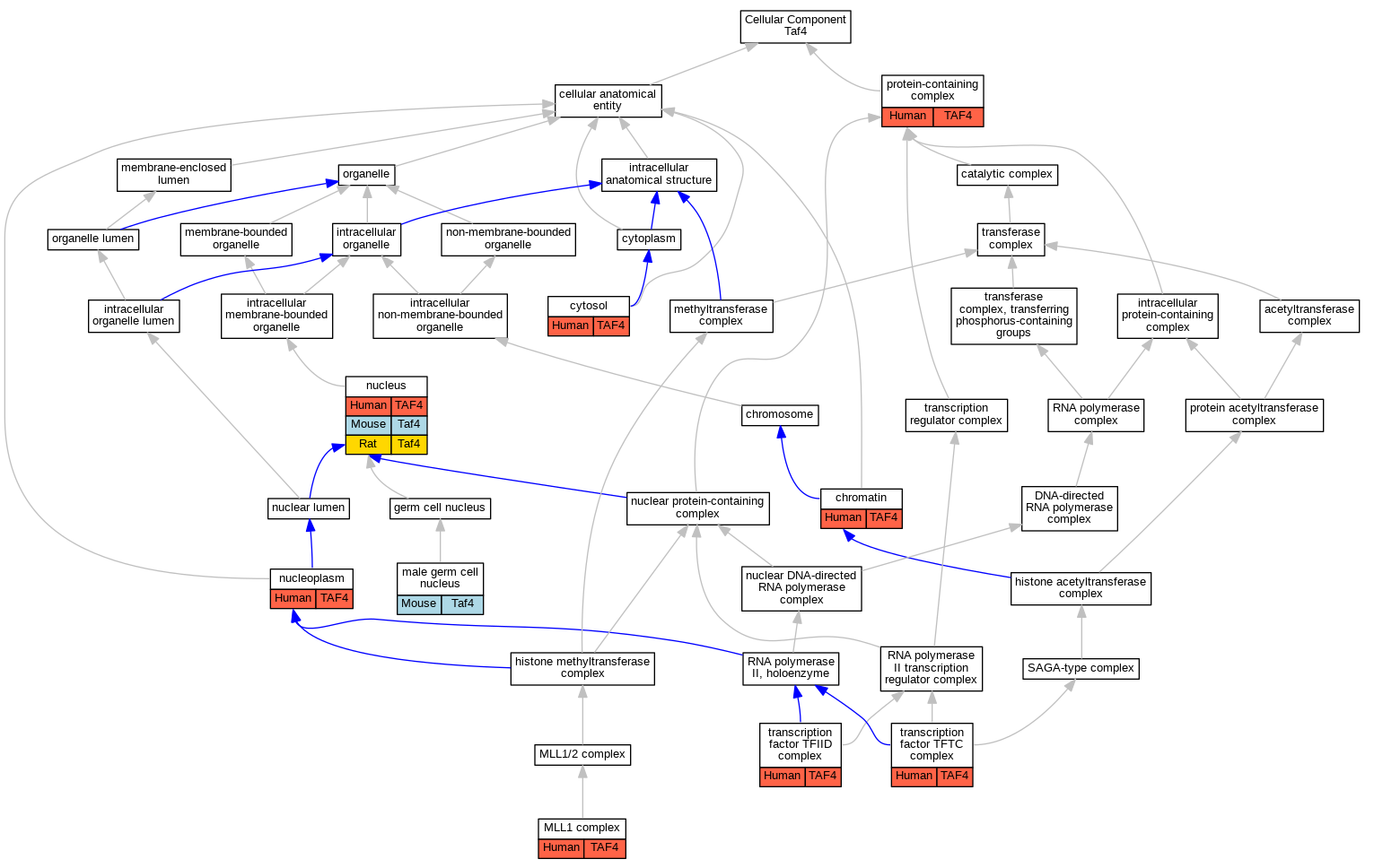 | Cellular Component | GO:0071339 | MLL1 complex | TAF4 | IDA | Human | PMID:15960975 | |