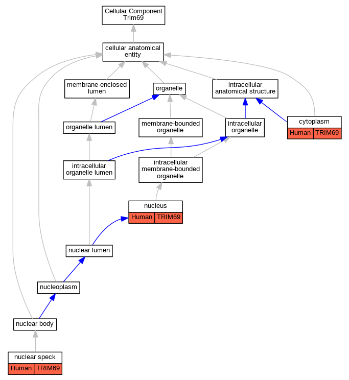 | Cellular Component | GO:0016607 | nuclear speck | TRIM69 | IDA | Human | PMID:23131556 | |