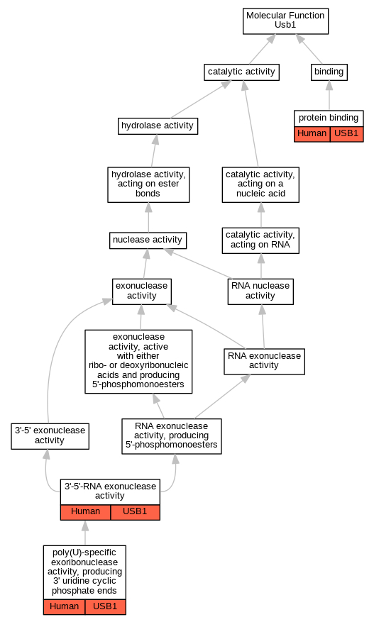 | Molecular Function | GO:0000175 | 3'-5'-RNA exonuclease activity | USB1 | IDA | Human | PMID:30215753 | |