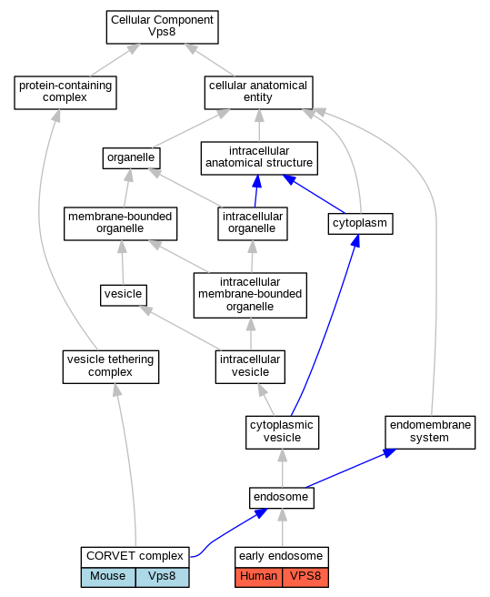 | Cellular Component | GO:0033263 | CORVET complex | Vps8 | IDA | Mouse | MGI:MGI:5645189|PMID:25266290 | |