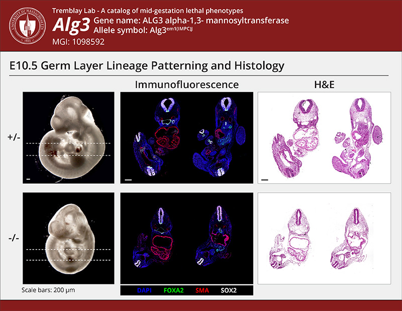 | Caption | E10.5 Alg3em1(IMPC)J/Alg3em1(IMPC)J (-/-) embryos are smaller than control littermates and as revealed by the H&E staining the loose mesenchyme surrounding the neural tube, particularly in the anterior portion of the embryo appears less dense than the control littermates. | ||||
