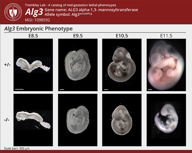 | Caption | Alg3em1(IMPC)J/Alg3em1(IMPC)J (-/-) embryos are normal at E8.5. By E9.5 they are sometimes smaller and a minority display abnormal tail placement or shortened tails, although overall are difficult to discern from their litter mates. By E10.5 the homozygous mutants are apparent and are delayed with abnormal head shape, particularly the forebrain. Many have cardiac defects and abnormal blood pooling in head and heart. All mutants are dying by E11.5. | ||||