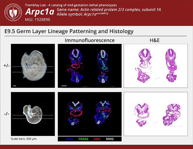 | Caption | This Arpc1aem1(IMPC)J/Arpc1aem1(IMPC)J (-/-) embryo has an open cranial neural tube, as more clearly seen in the H&E staining, but has appropriately initiated formation of all 3 germ layers as have all examined (n=3). | ||||