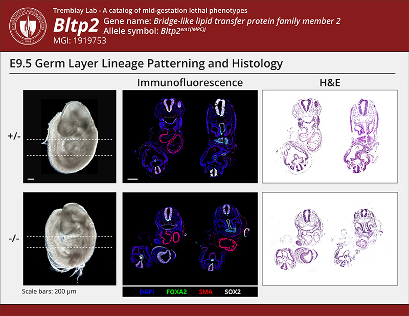 | Caption | At E9.5, Bltp2em1(IMPC)J/Bltp2em1(IMPC)J (-/-) embryos are generally smaller but indistinguishable from littermates and display appropriate germ layer development. | ||||