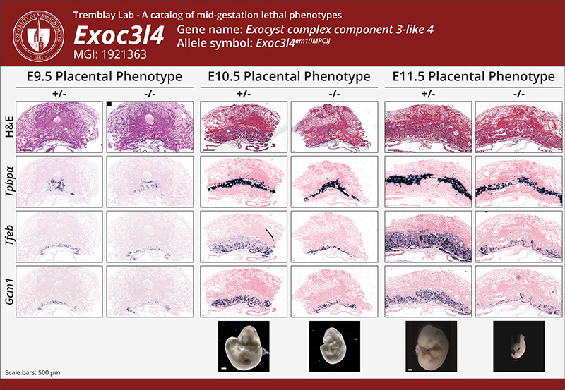 | Caption | At E9.5, Exoc3l4em1(IMPC)J/Exoc3l4em1(IMPC)J (Exoc3l4-/-) placentas demonstrate largely normal development. However, an abnormally large accumulation of maternal blood is observed adjacent to the labyrinth trophoblasts. At E10.5, Exoc3l4-/- placentas exhibit multiple labyrinth zone defects compared to controls. In KO placentas, the Tfeb+ labyrinth trophoblast layer is markedly reduced and Gcm1+ chorioallantoic branching is impaired. An abnormally large accumulation of maternal blood is observed adjacent to the labyrinth trophoblasts. By E11.5, Exoc3l4-/- placentas show a more severe manifestation of the E10.5 defects. | ||||