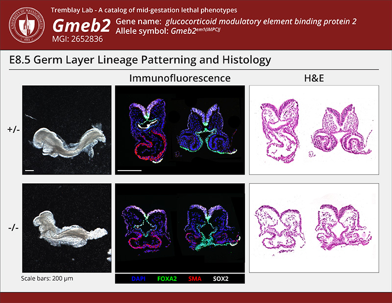| Caption | At E8.5, Gmeb2em1(IMPC)J/Gmeb2em1(IMPC)J embryos are indistinguishable from controls and initiate cardiac development as well as normal gut tube closure. | ||||