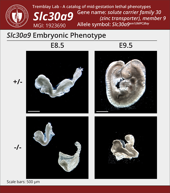| Caption | Slc30a9em1(IMPC)Bay/Slc30a9em1(IMPC)Bay (Slc30a9-/-) embryos at E8.5 are always smaller than their control littermates. Although only a minority of Slc30a9-/- are categorized as delayed at E8.5 most display an abnormal allantois that is often blebby at the tip and irregularly shaped (see others below). The head shape is sometimes abnormal. By E9.5 all Slc30a9-/- embryos are delayed, all have an abnormal head shape and abnormal yolk sacs, most have failed to close their cranial neural tube and all are unturned. In the majority of E9.5 Slc30a9-/- embryos, instead of forming a functional connection with the chorion (as in the example provided), the allantois has balled up at the tip of the tail. | ||||