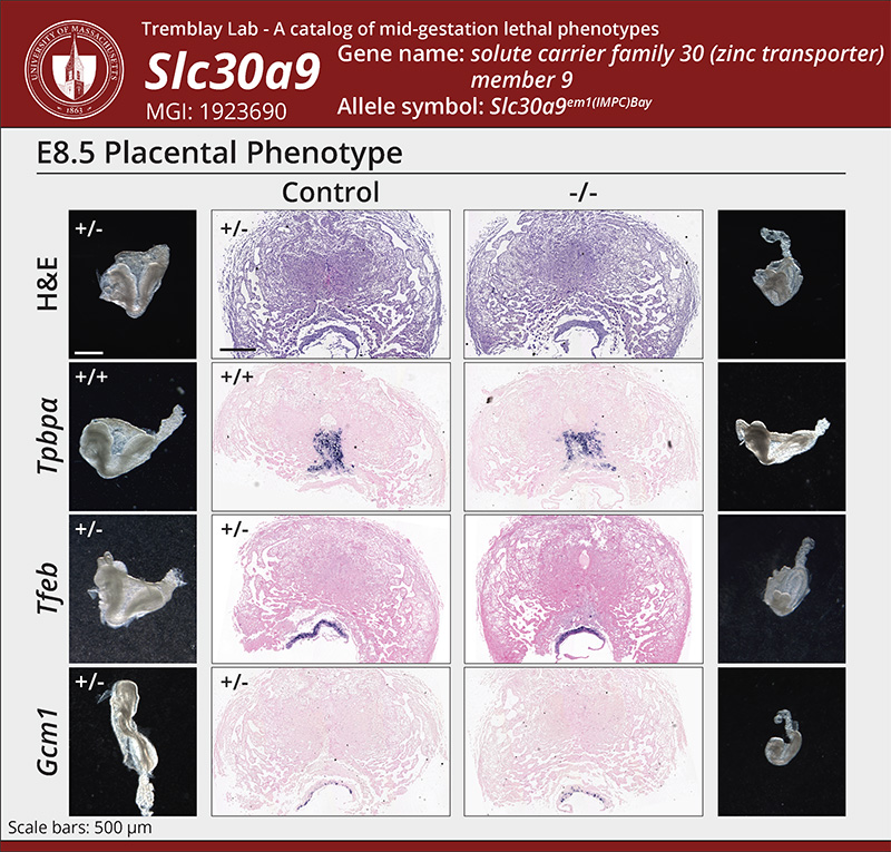 | Caption | At E8.5, Slc30a9em1(IMPC)Bay/Slc30a9em1(IMPC)Bay (-/-) placentas appear properly developed and comparable to littermate controls. | ||||