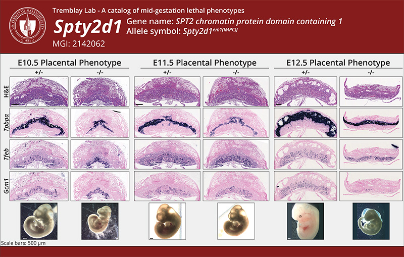 | Caption | Spty2d1em1(IMPC)J/Spty2d1em1(IMPC)J (Spty2d1-/-) placenta phenotypes. At E10.5, the Spty2d1-/- placentas examined exhibit a reduction in the Tpbpa+ spongiotrophoblast (SpT) layer. While the thickness of the Tfeb+ labyrinth trophoblast layer is comparable to controls, elevated Tfeb signal intensity suggests an increased density of Tfeb+ cells. At E11.5, Spty2d1-/- placentas show a more severe manifestation of the E10.5 defects. By E12.5, Spty2d1-/- placentas exhibit a severely reduced Tpbpa+ SpT layer, diminished Tfeb+ labyrinth layer, and impaired Gcm1+ chorioallantoic branching. | ||||