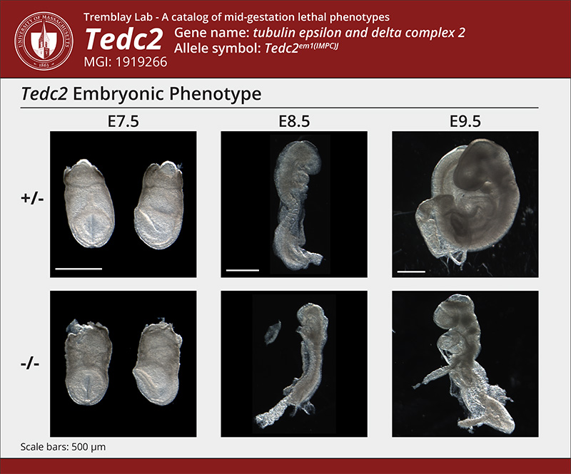 | Caption | Tedc2em1(IMPC)J/Tedc2em1(IMPC)J (Tedc2-/-) embryonic phenotype. Tedc2-/- embryos appear normal at E7.5. By E8.5 Tedc2-/- are mainly normal in appearance but over half have an abnormal head shape. By E9.5 all Tedc2-/- embryos are easily discerned from their control counterparts. The most penetrant phenotypes include failure to turn, kinked caudal neural tube, laterally splayed and open cranial neural tube, abnormal head shape, the heart shape is abnormal and the heart itself often edemic. | ||||
