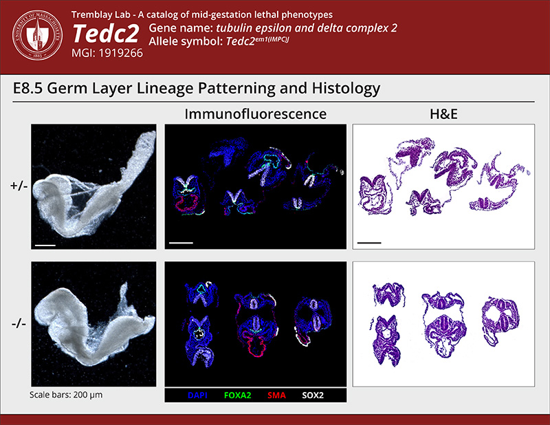 | Caption | At E8.5, all Tedc2em1(IMPC)J/Tedc2em1(IMPC)J (Tedc2-/-) mutants analyzed lack an appropriately patterned ventral neural tube as indicated by the absence of FoxA2 in the floorplate. Furthermore the notochord is absent in portions of the embryo. When the notochord is absent, the gut tube is abnormally proximal to the neural tube as in the middle section of the mutant presented. | ||||